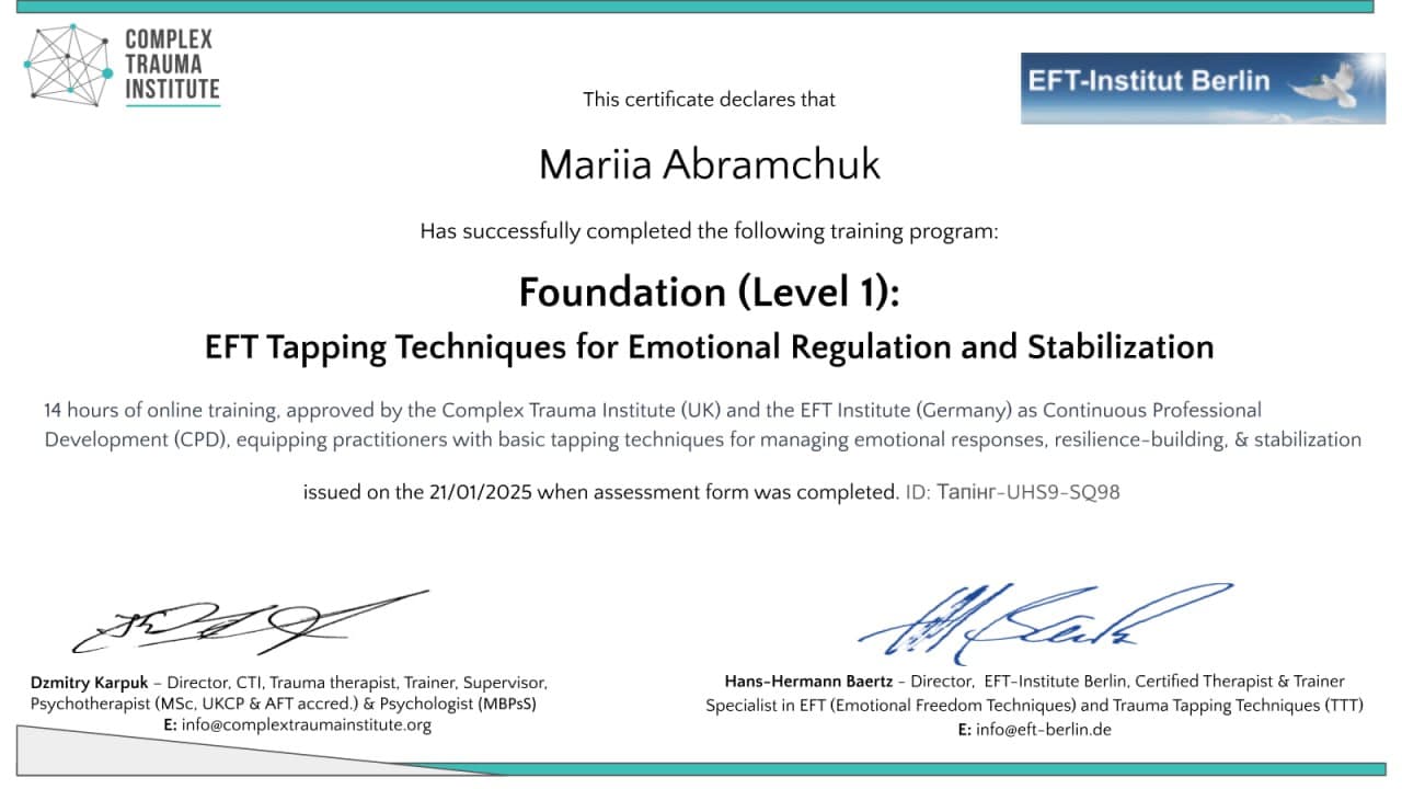 Дотримуюсь клієнт-центрованого підходу, такий підхід обумовлений cімнадцятирічним досвідом в роботі з дорослими і підлітками та довів свою ефективність. Повністю згодна з твердженням, що кожна людина здатна знайти спосіб стати найкращою версією себе - за умови, якщо в цьому процесі його буде супроводжувати професіонал. Буду рада бути тим самим професіоналом!