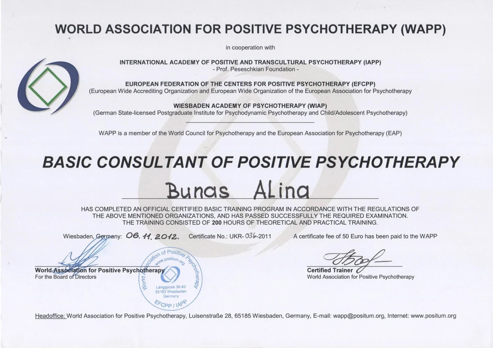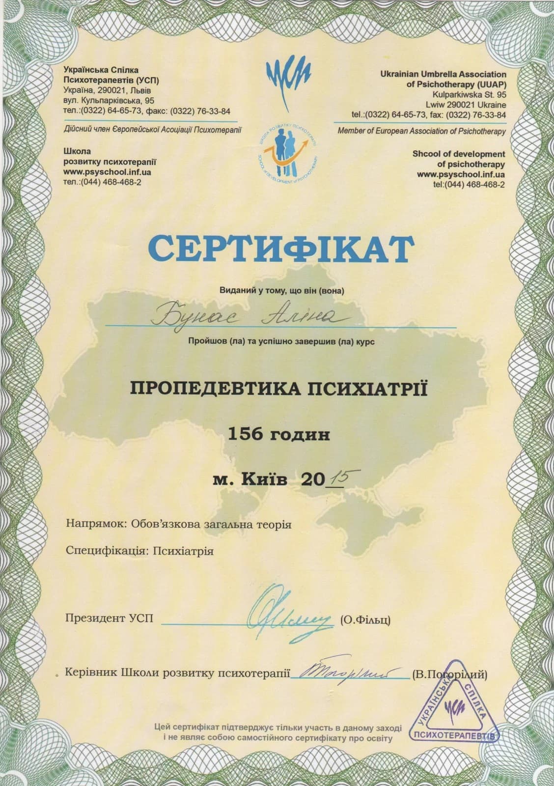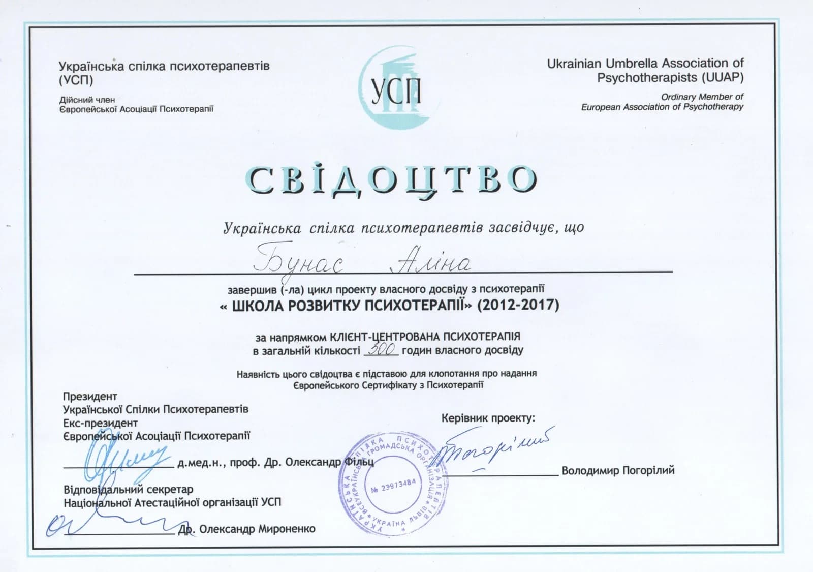 "Вітаю, мене звати Аліна Бунас, я – практикуючий психолог, психотерапевт з 15-річним стажем, кандидат психологічних наук, член Української спілки психотерапевтів та Української психологічної асоціації.