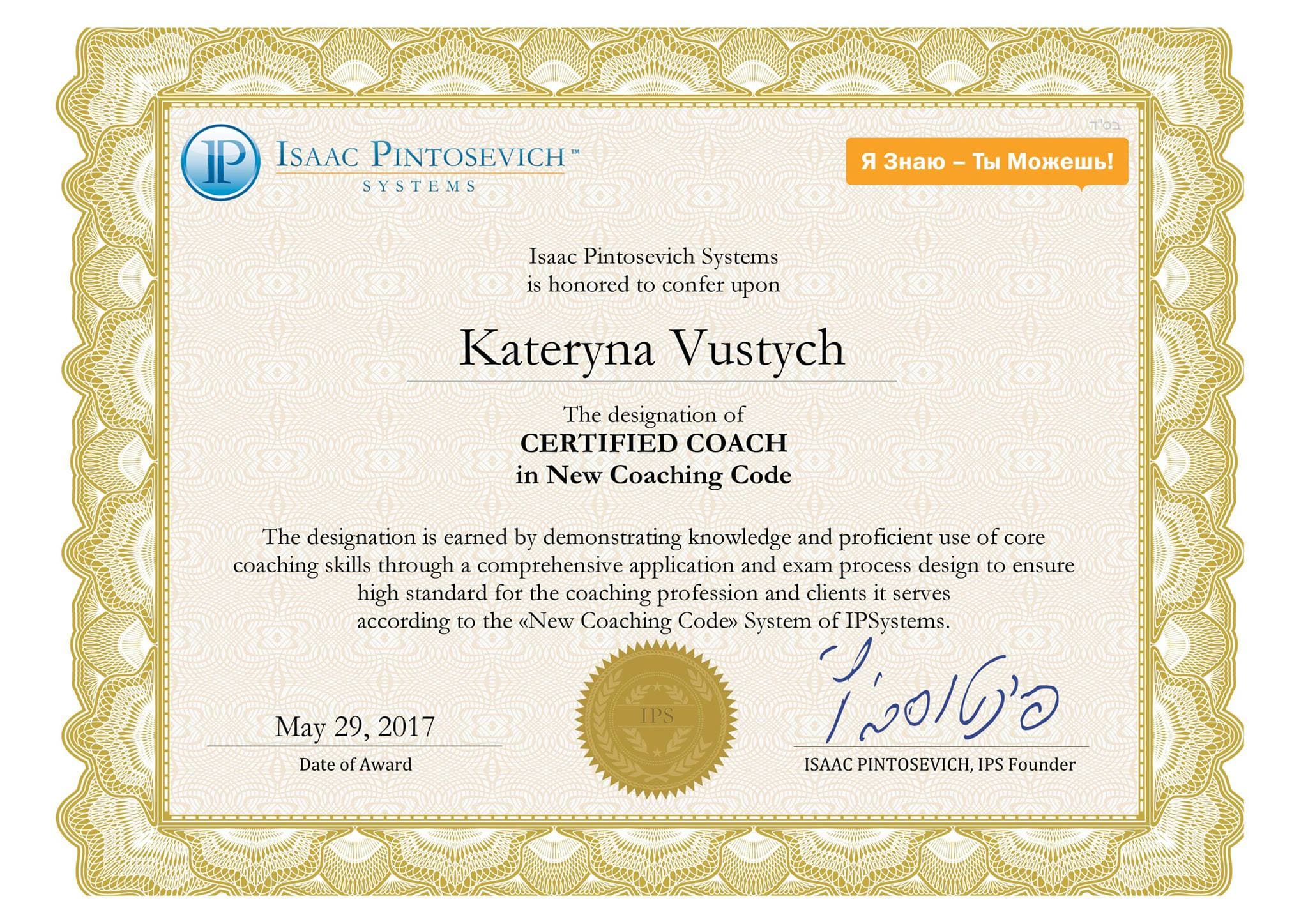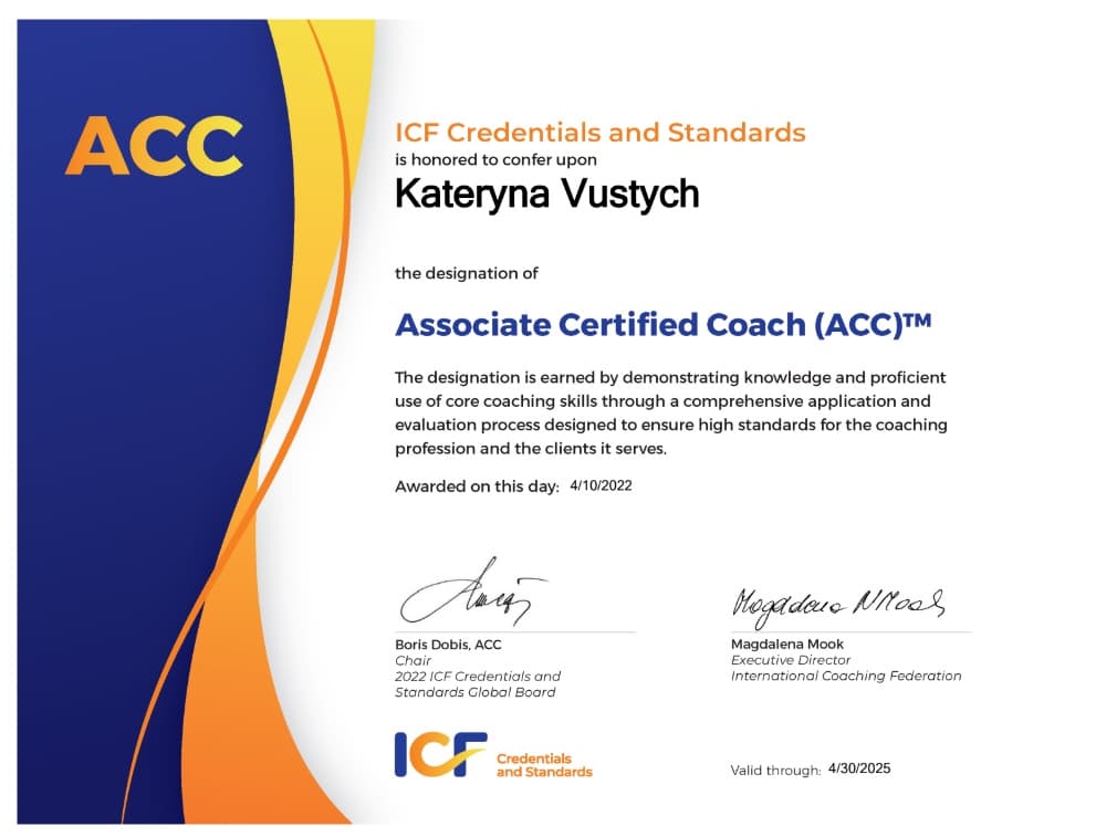 "Вітаю, мене звати Катерина Вустич, сертифікований коуч ICF. Я сприяю реалізації людського потенціалу на максимум шляхом створення результатів та відносин.