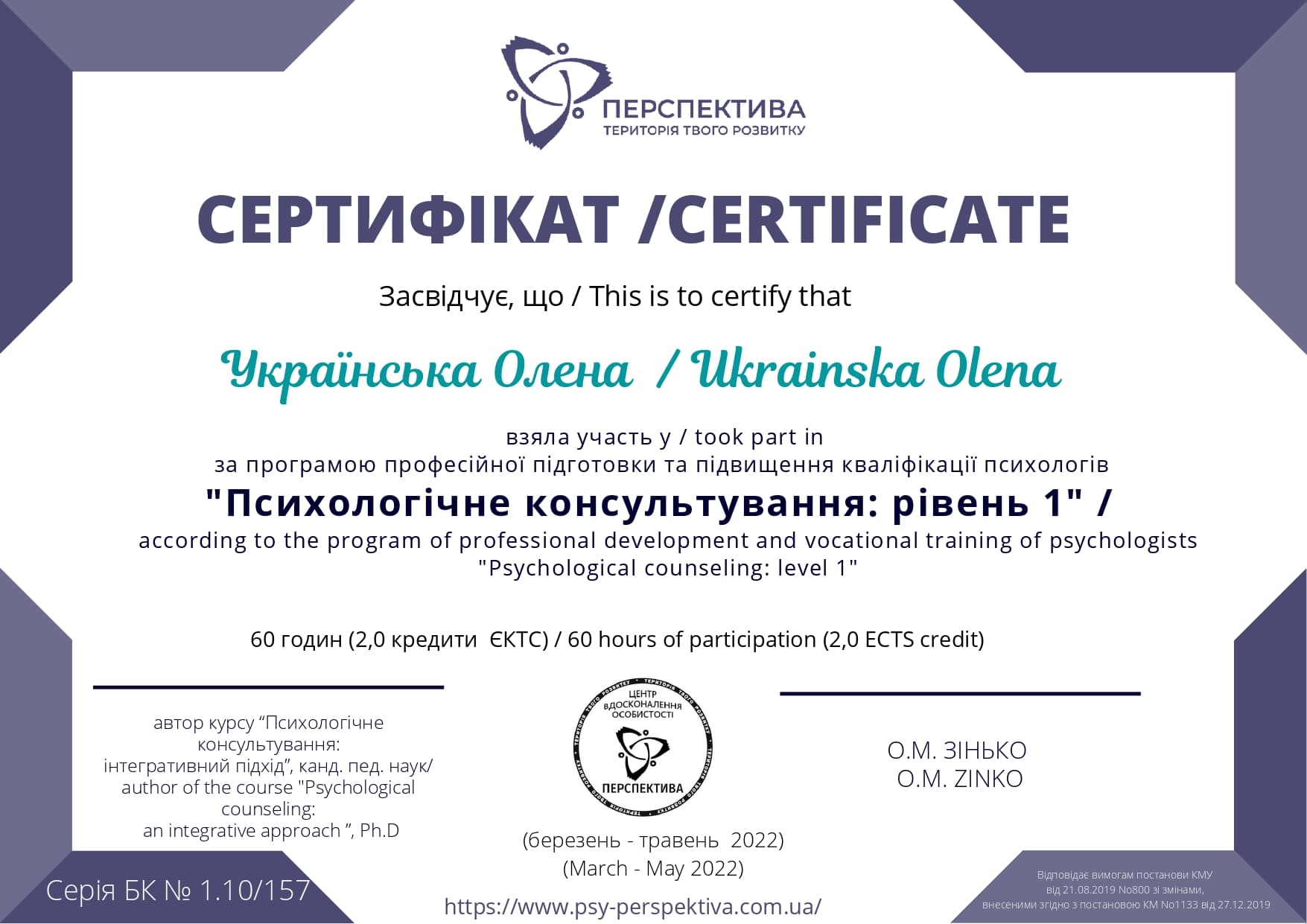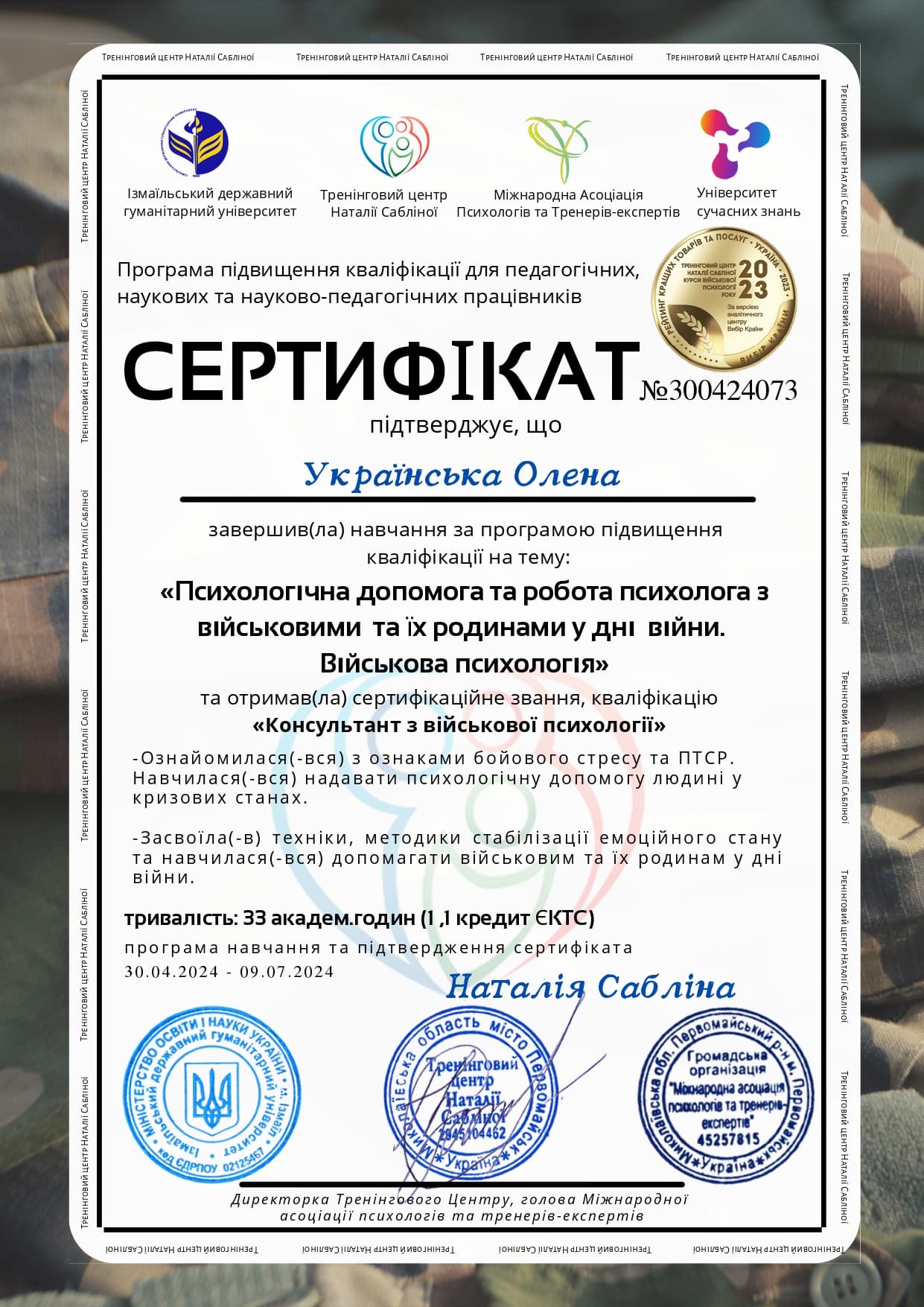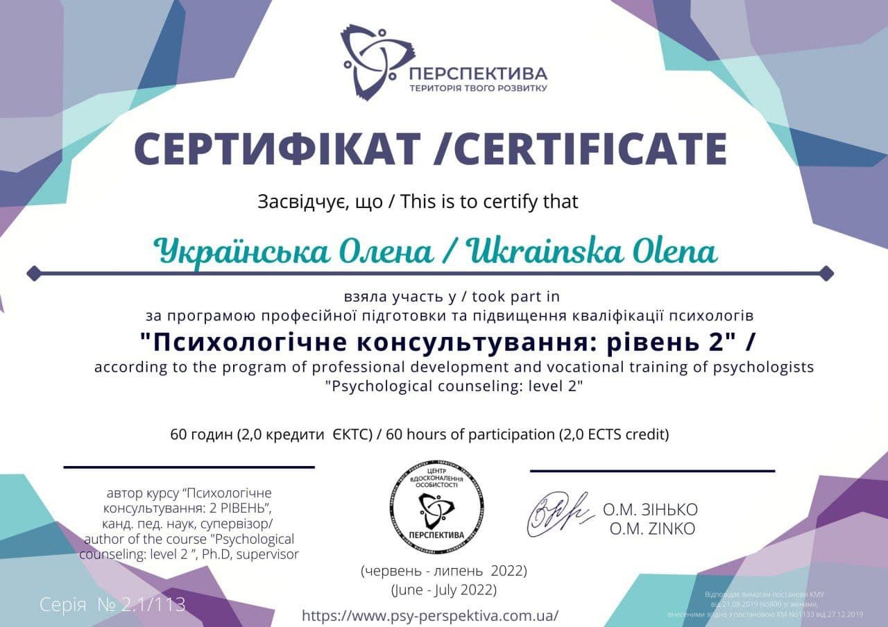 "Вітаю! Мене звати Олена Українська. Я - психолог, бізнес-тренер, арт-коуч, який допомагає справлятися з проблемами психічного здоров'я, стресом, тривогою, емоційними проблемами та складними життєвими ситуаціями, ПТСР, використовуючи інтегративний підхід (психологічне консультування, техніки КПТ, арт-терапії та коучингу, навчання технікам самодопомоги).