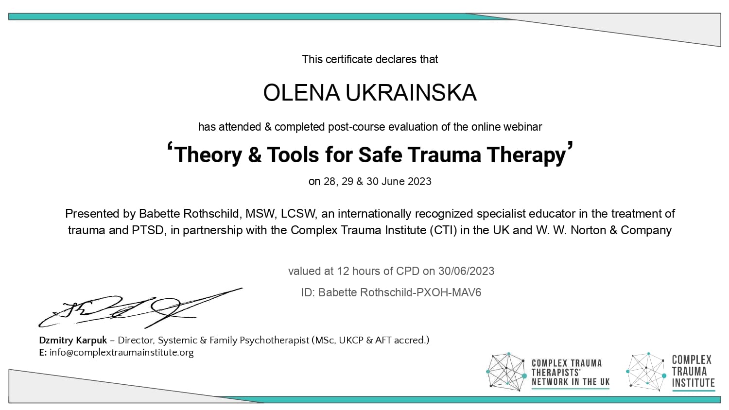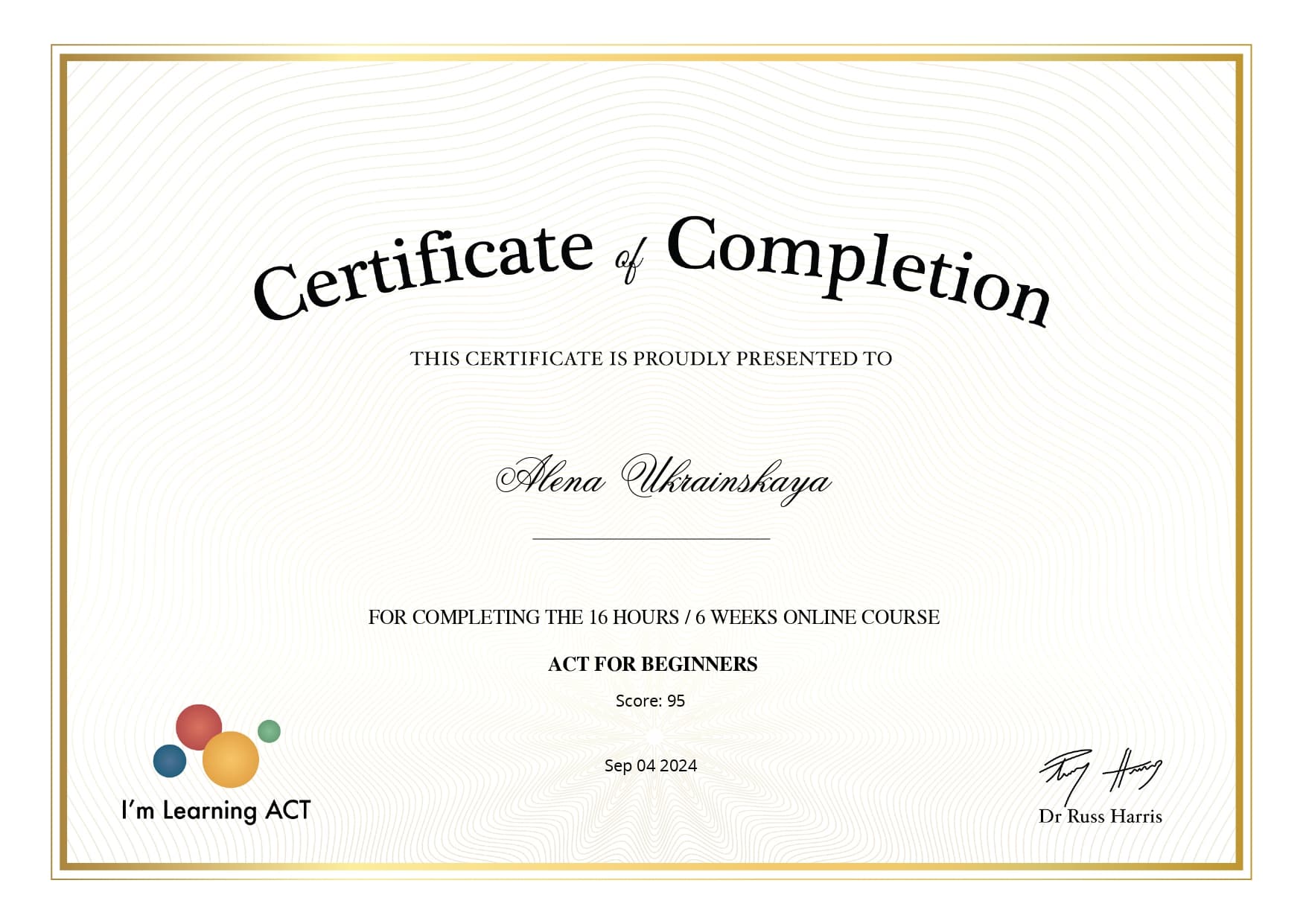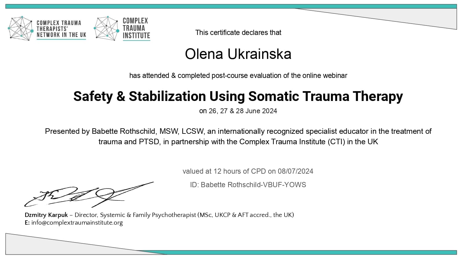 "Вітаю! Мене звати Олена Українська. Я - психолог, бізнес-тренер, арт-коуч, який допомагає справлятися з проблемами психічного здоров'я, стресом, тривогою, емоційними проблемами та складними життєвими ситуаціями, ПТСР, використовуючи інтегративний підхід (психологічне консультування, техніки КПТ, арт-терапії та коучингу, навчання технікам самодопомоги).