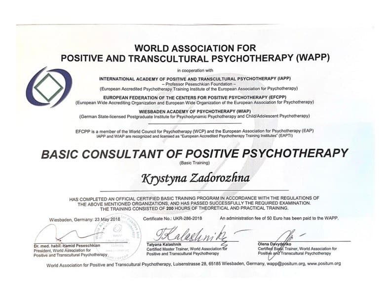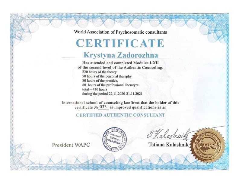 Я практикуючий психолог, досвід роботи 6 років. Працюю з дорослими, сімейними парами. Проводжу індивідуальні терапевтичні сесії та психологічні консультації."