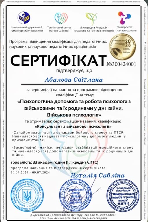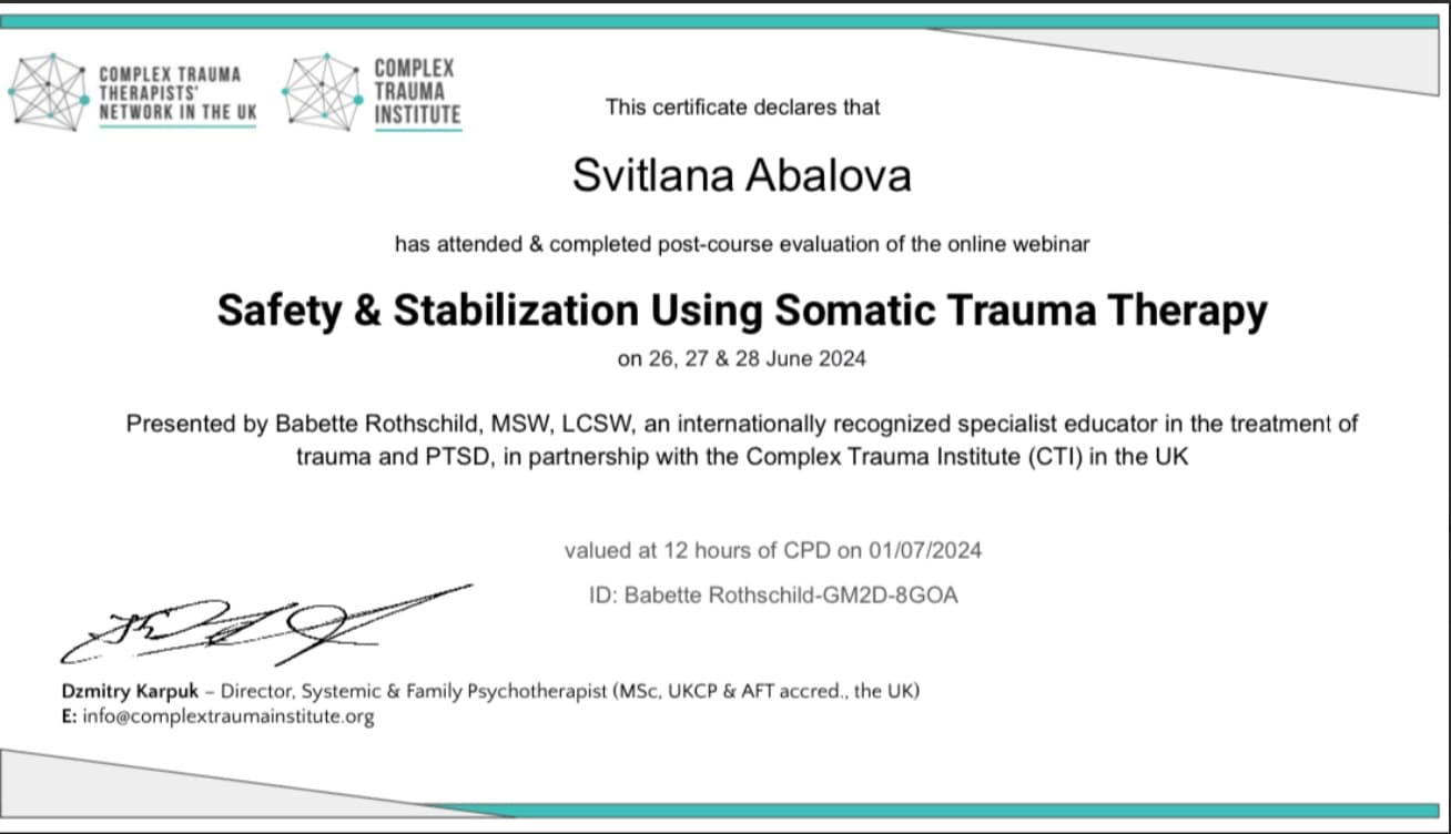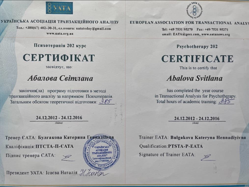 Працює з дорослими, дітьми з10 років та сімейними парами.
