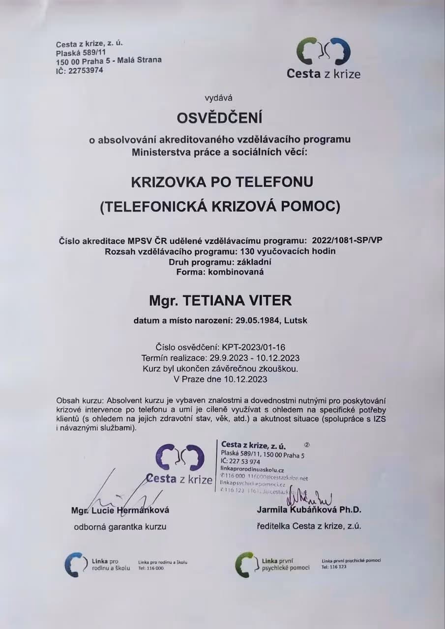 2023 - Акредитована програма Міністерства праці та соціальних питань Чехії, Кризова допомога по телефону.