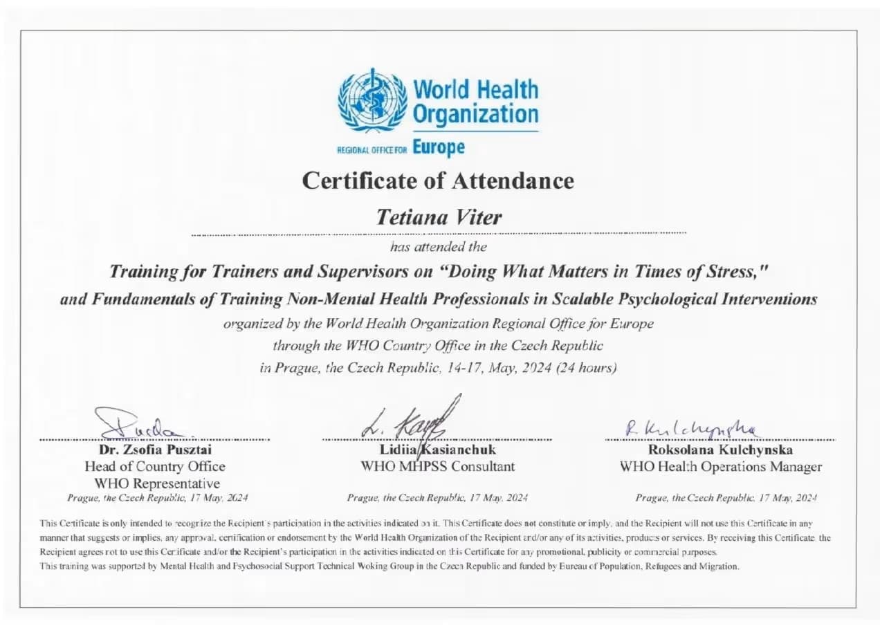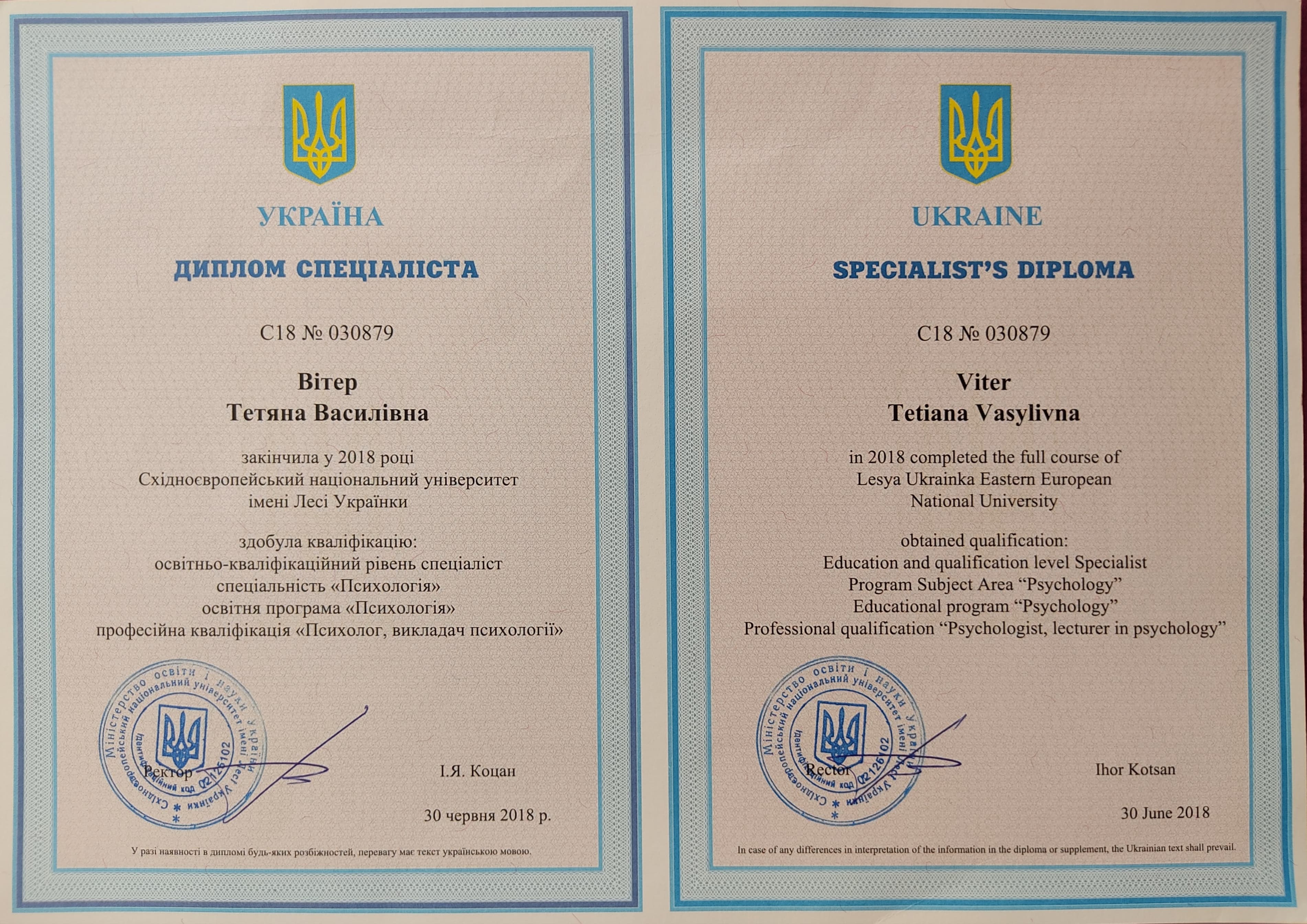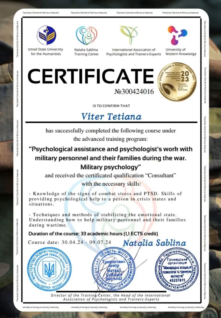 Саме тому я безмежно вдячна організації, яка забезпечила психологічну підтримку, і дала мені можливість працювати з Тетяною Вітер — фахівчинею найвищого рівня.