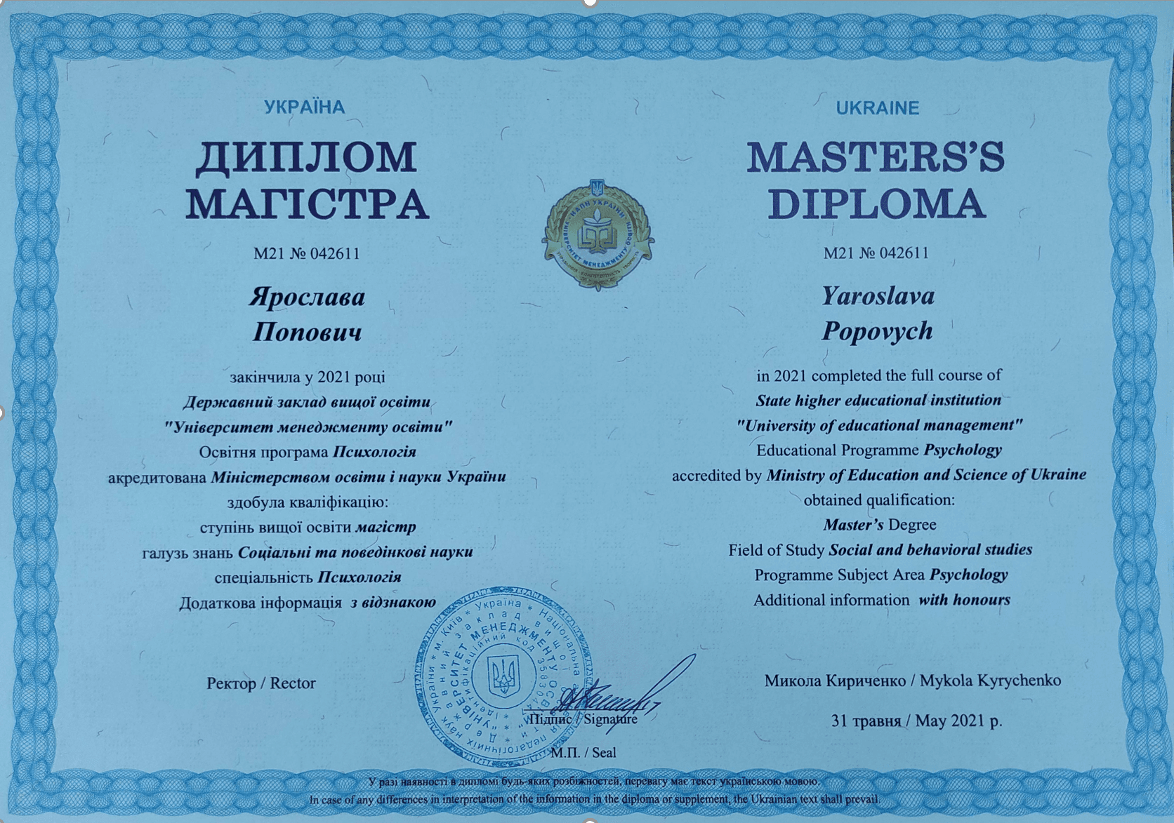 2021 - Державний заклад вищої освіти “Університет менеджменту освіти”. Освітня програма Психологія. Кваліфікація магістр. Галузь: Соціальні та поведінкові науки. Спеціальність: Психологія. З відзнакою.