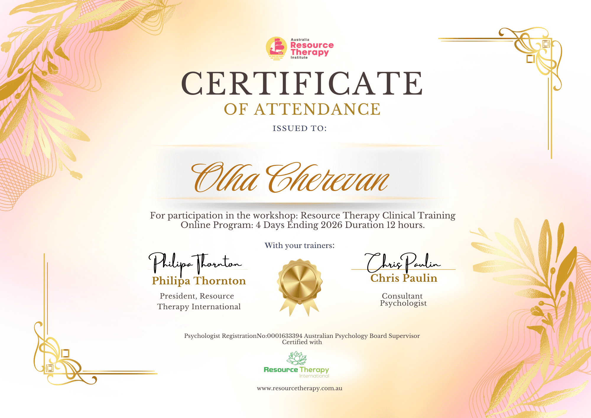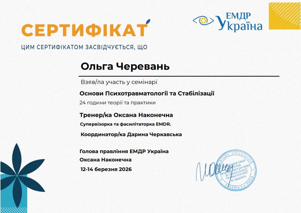 "Вітаю, мене звуть Ольга Черевань, я гештальт - терапевт , практичний психолог вищої категорії, психолог методист та процесуальний психолог. Щаслива дружина та мама двох дорослих доньок.