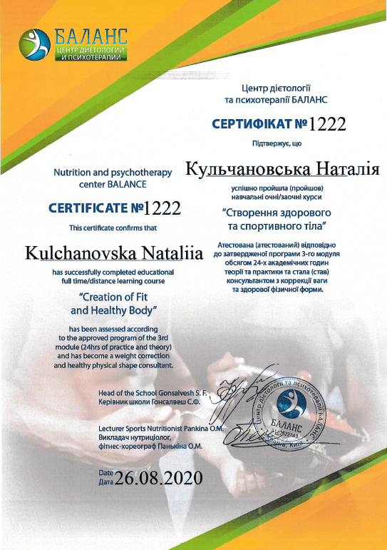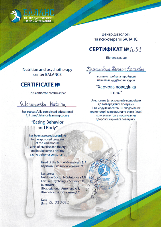 Вітаю! Мене звати Кульчановська Наталія - лікарка нутриціологиня. Допомагаю людям знаходити гармонію в собі, у стосунках і в тілі, поєднуючи науковий підхід та індивідуальну турботу. Рада буду підтримати вас на шляху до змін.